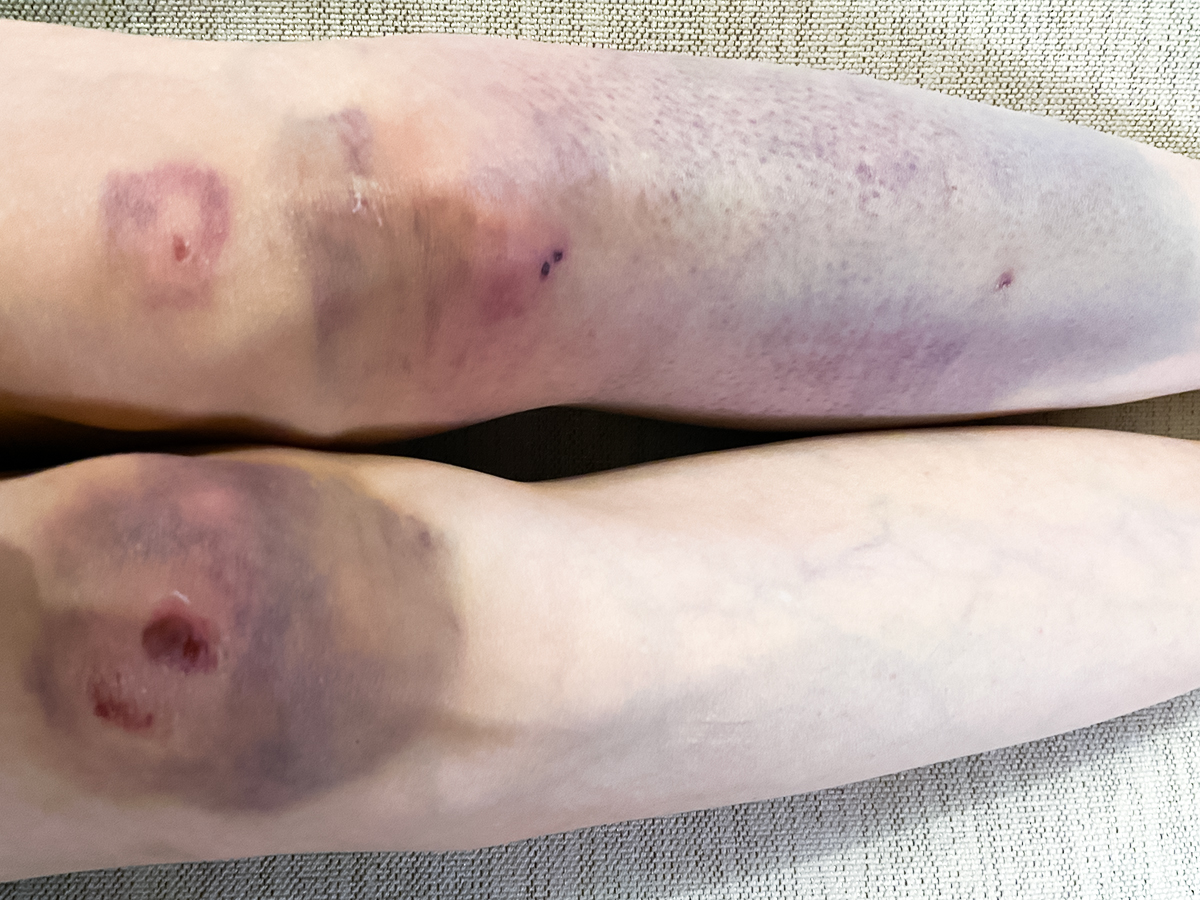 左膝から足首までを強打し、右手の平も擦りむきました。