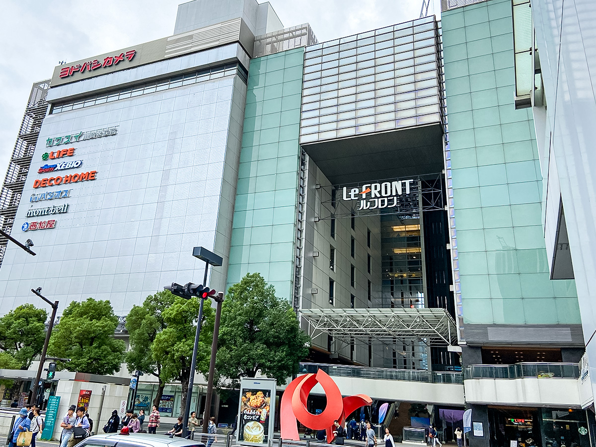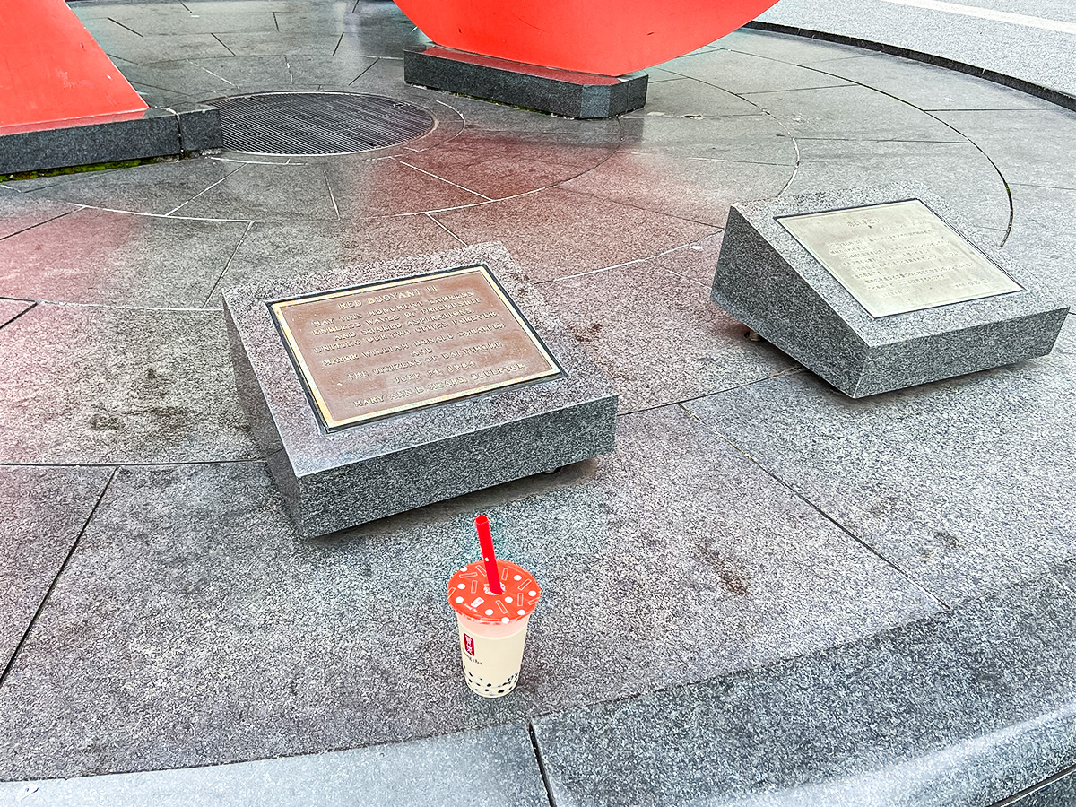 1階まで降りて、ルフロン前の広場にある赤いモニュメントの前でいただきました。