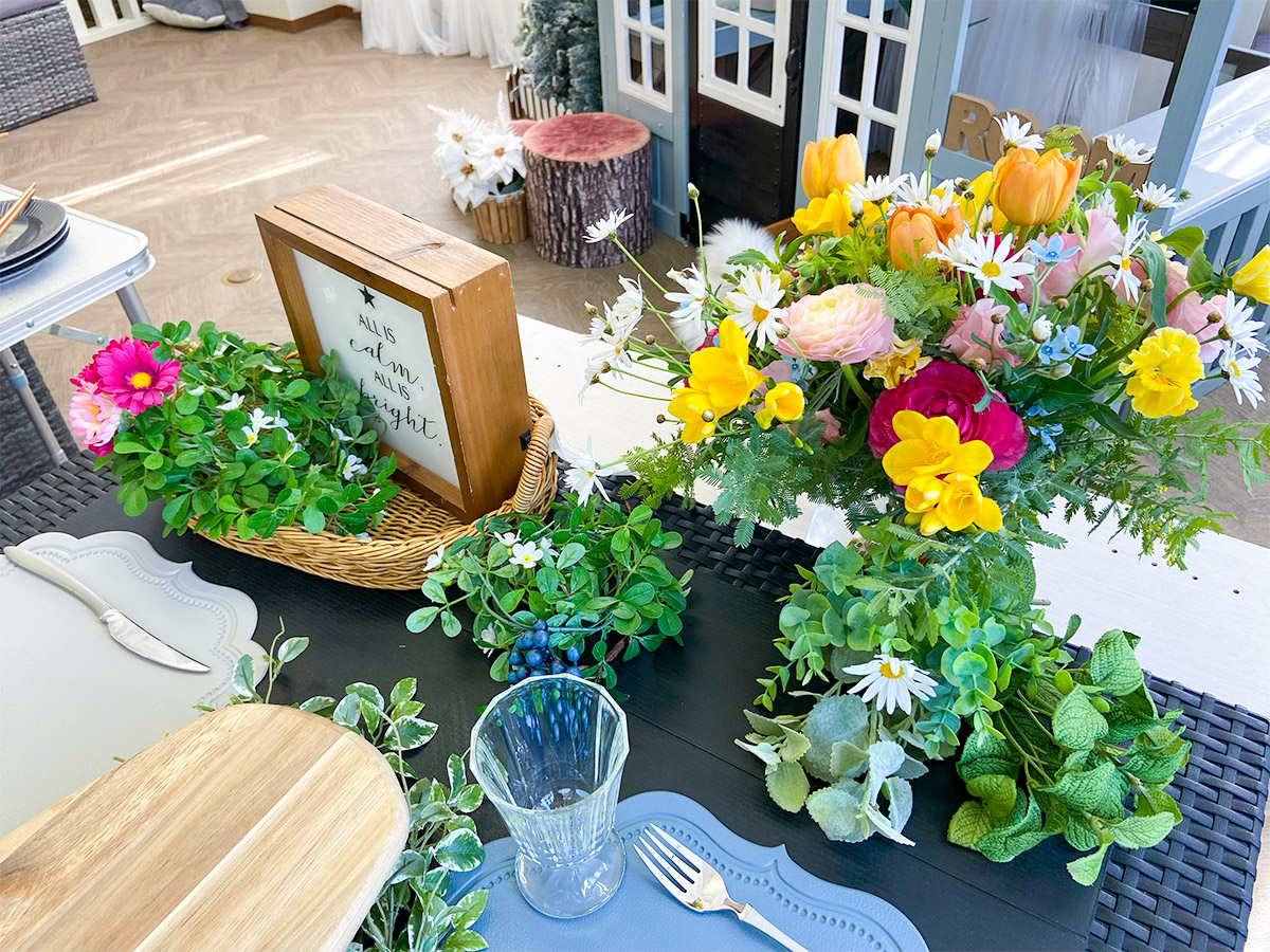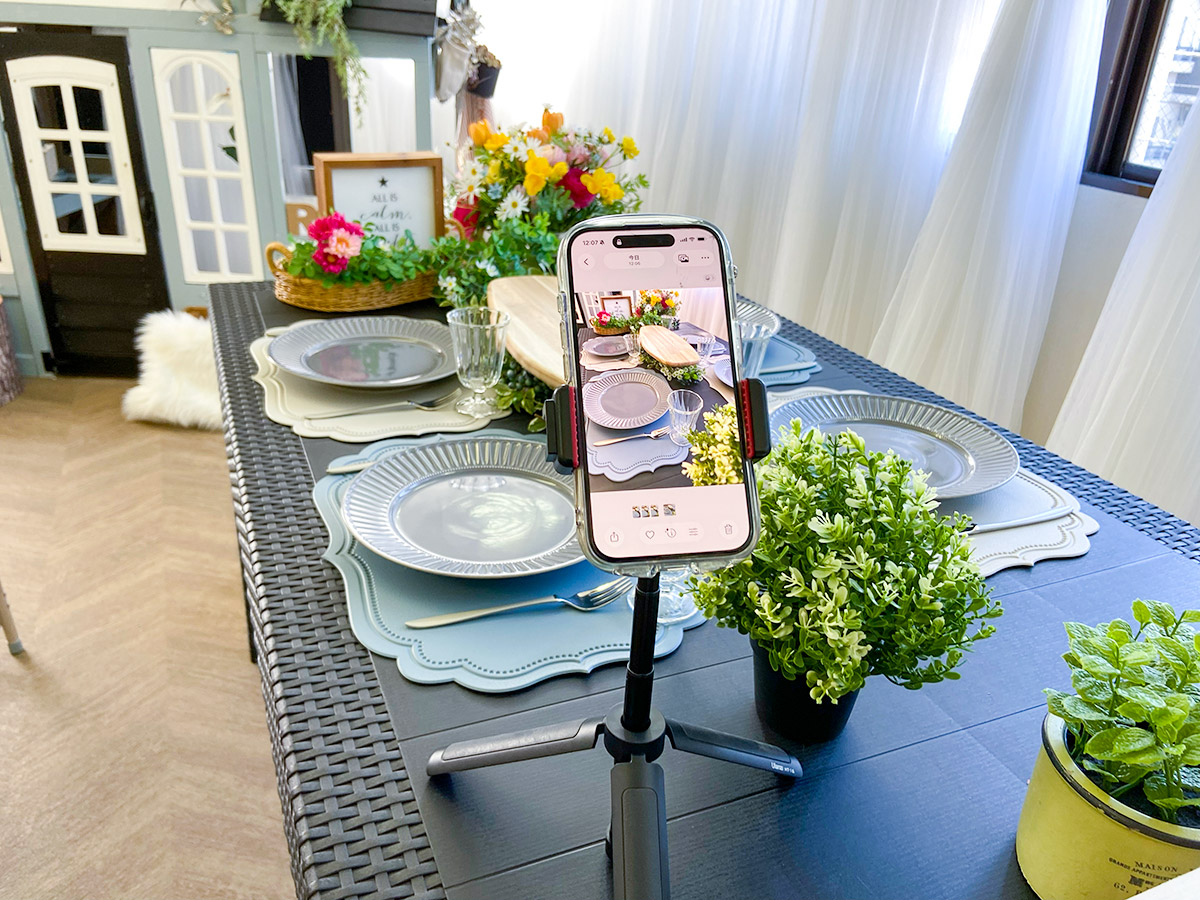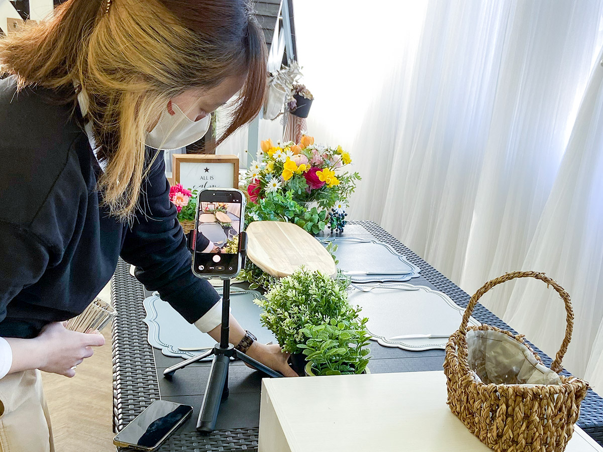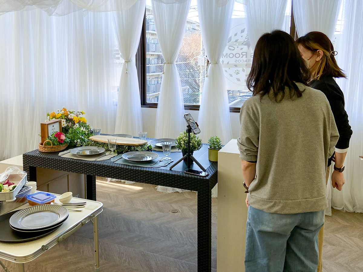 テーブルコーディネートやお花、小物まで丁寧に準備され、いつものPAWS ROOMが、少し表情を変えた撮影仕様に。お皿の配置や角度、背景に入る生花やグリーンの見え方などを確認しながら、実際の利用シーンをイメージして撮影が進められていました。