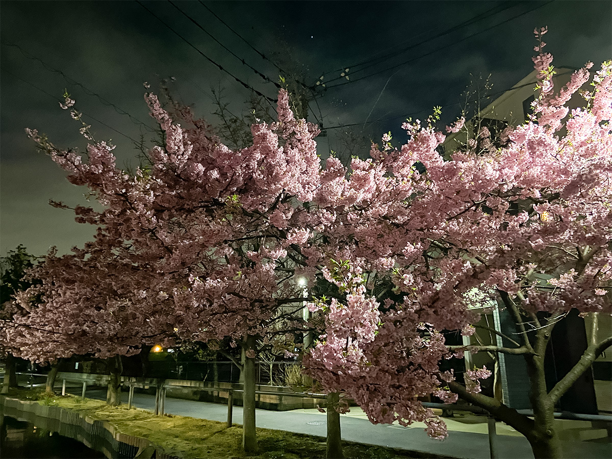 街灯に照らされた河津桜。昼間とは違い、少し幻想的な雰囲気になります。