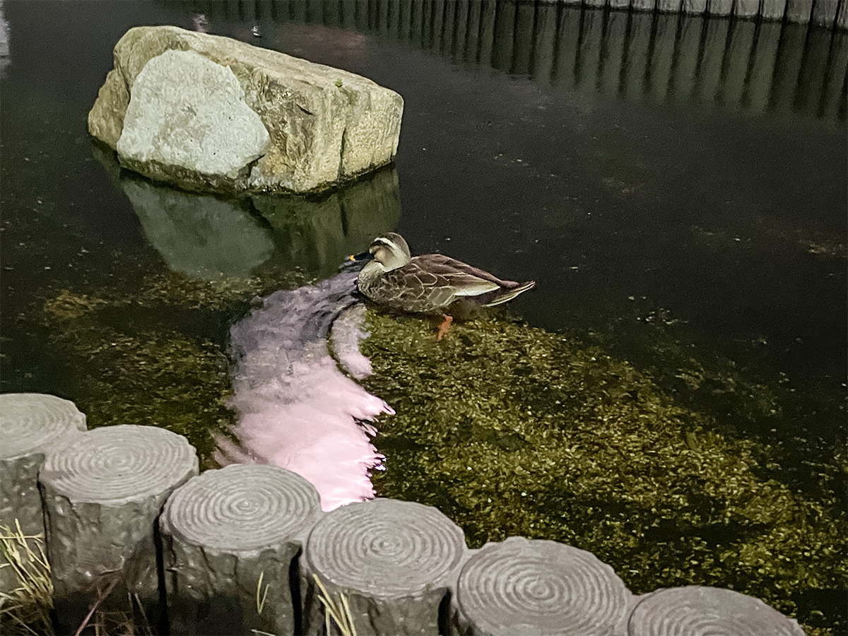夜の川で眠っていたカルガモ。江川ではカルガモの姿もよく見られます。