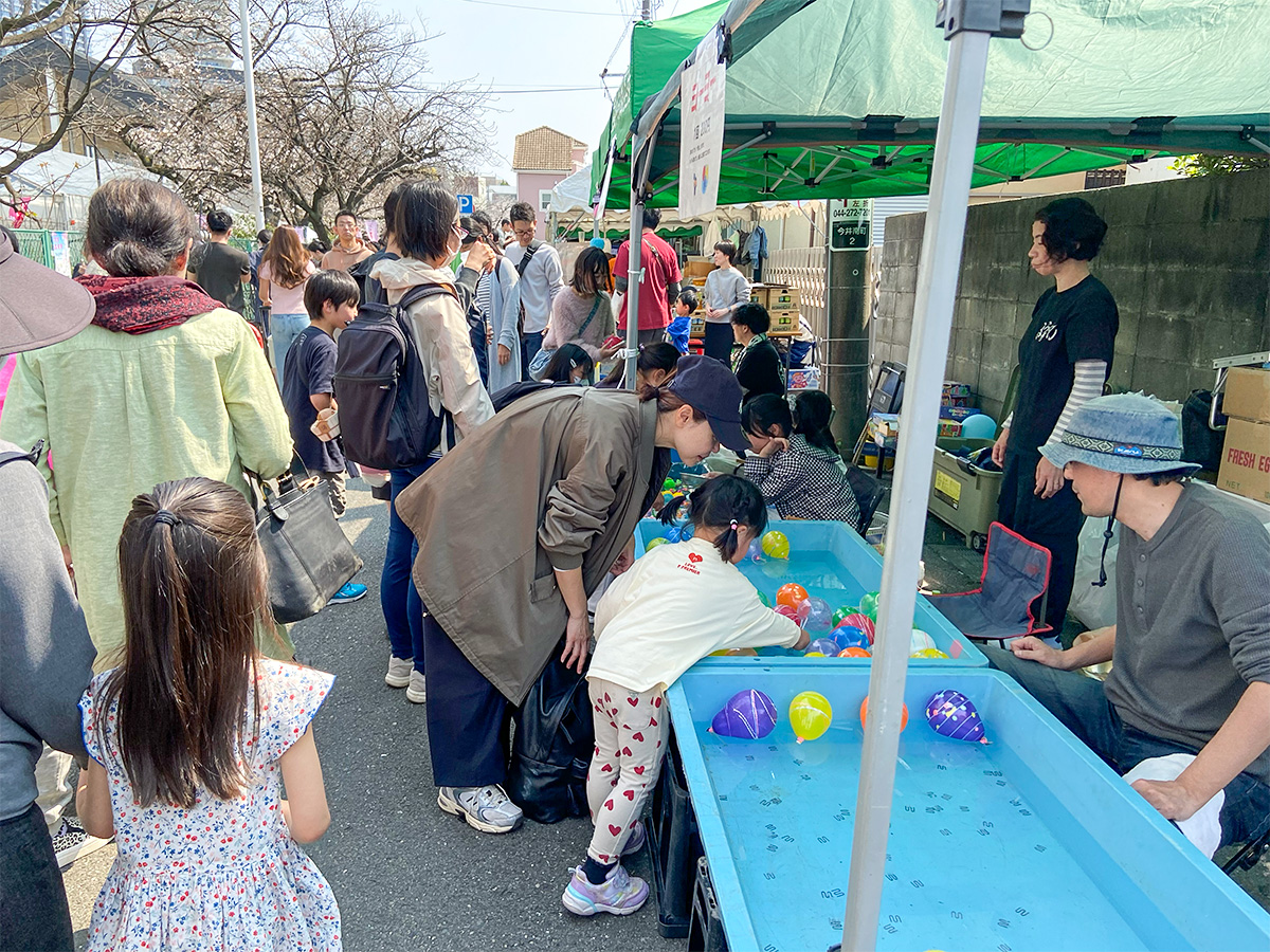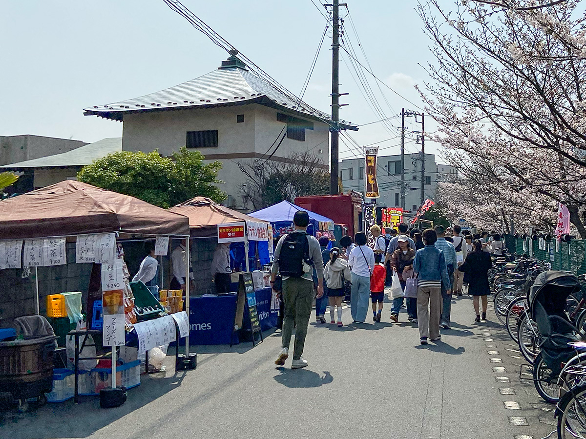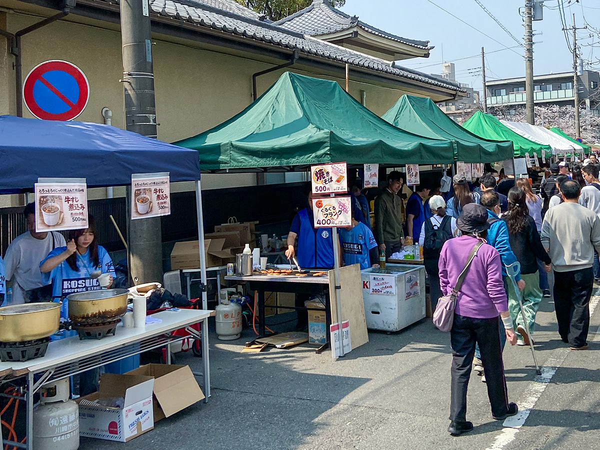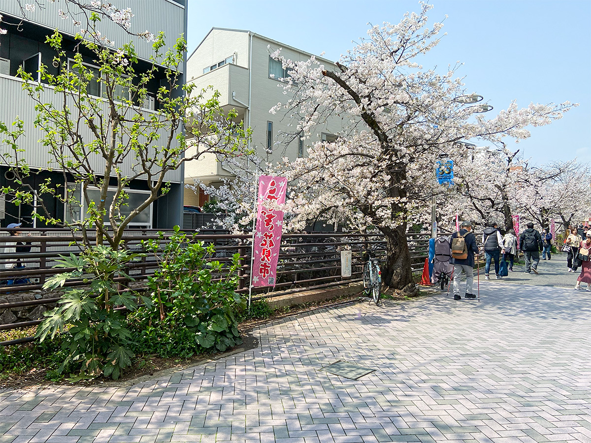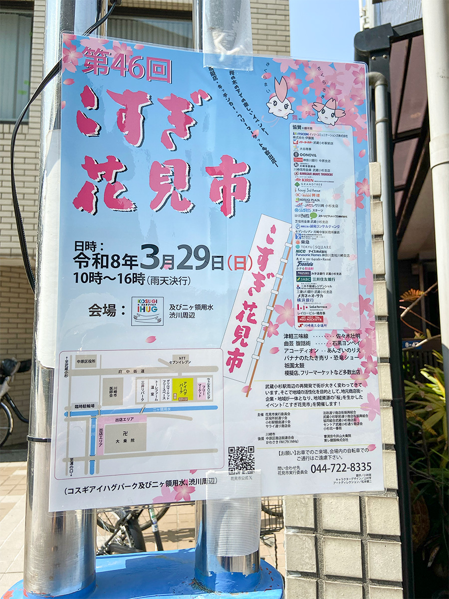 武蔵小杉駅周辺の複数の商店街(小杉三丁目商店街、小杉町3丁目中央商店街など)が協力して開催しているのが特徴で、約300本のソメイヨシノなどが植えられている二ヶ領用水や渋川周辺のエリアに、屋台やフリーマーケットが所狭しと並ぶ、まさに「花見」と「市(いち)」が楽しめるイベントです。